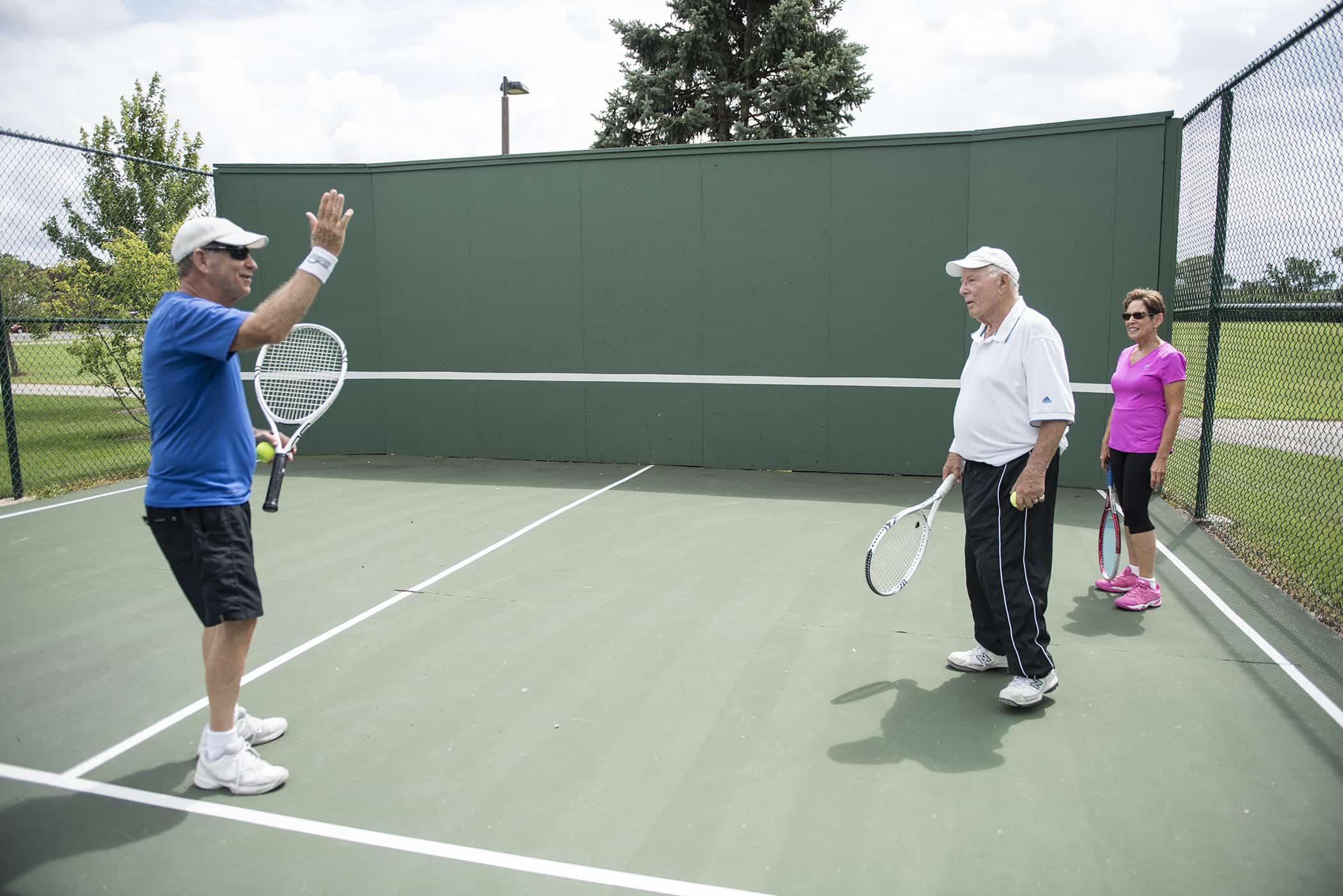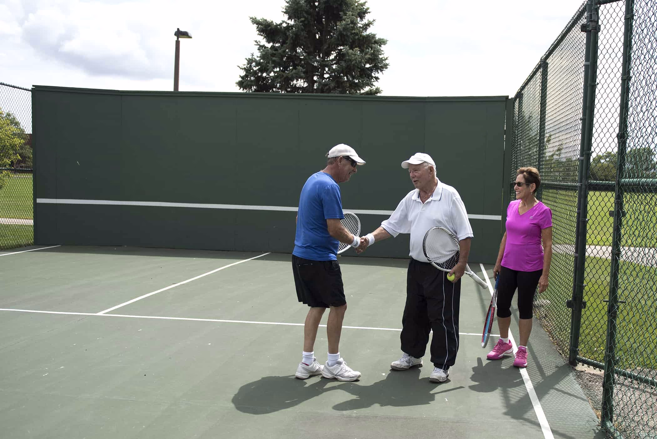 It was a ‘golden’ afternoon at Wood Oaks Green Park when we happened upon Grant Golden practicing the game that made him famous. Golden was ranked in the U.S. top 10 in singles in 1953, 1956, and 1957, was ranked # 2 in the U.S. in doubles in 1953 and was 2–1 in Davis Cup play in 1957. Geoff and Judy Gluck were playing nearby when Mr. Golden invited them over for an impromtu tennis lesson! Geoff is a tennis professional and former competitor and coach. He was so excited to connect with Grant whom he had met many decades ago when he coached girls’ tennis at Deerfield High School (Inducted into the Illinois High School Tennis Association Hall of Fame 2002). You never know what wonderful connections will be made when you head out to the park!