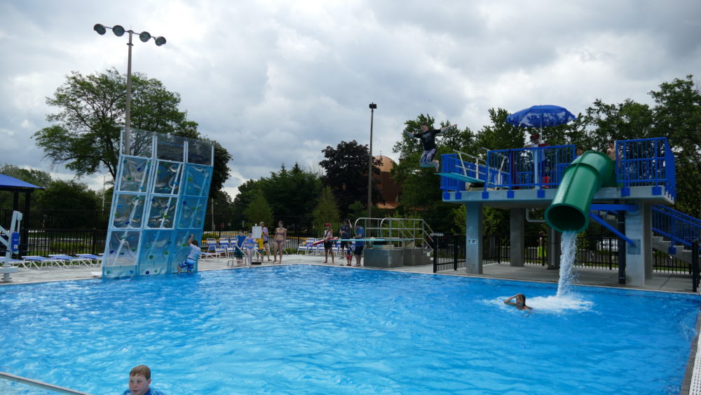 Northbrook Sports Center Pool features a 25-yard pool with six lanes, a leisure pool, a vortex pool, zero-depth entry, two diving boards, deep water diving pool with a drop slide and a climbing wall.
