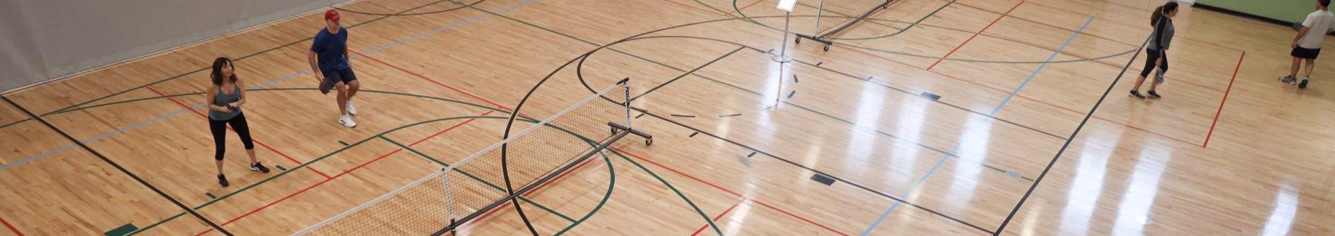 Four pickleball courts are available for singles/doubles play. There is maximum of 32 people allowed in the gym at one time. If there are any participants waiting to play, there needs to be a rotation after the completion of each game. If there is a team waiting to play, the losing team will sit allowing the waiting team to play next. Some time slots are reserved for 60+ only.